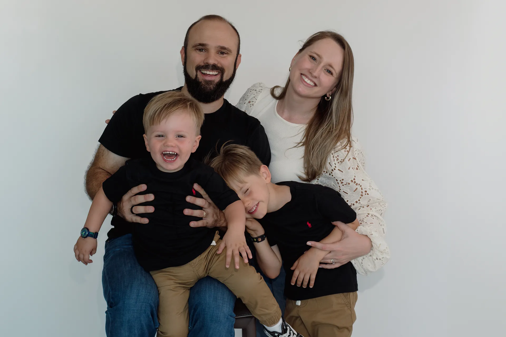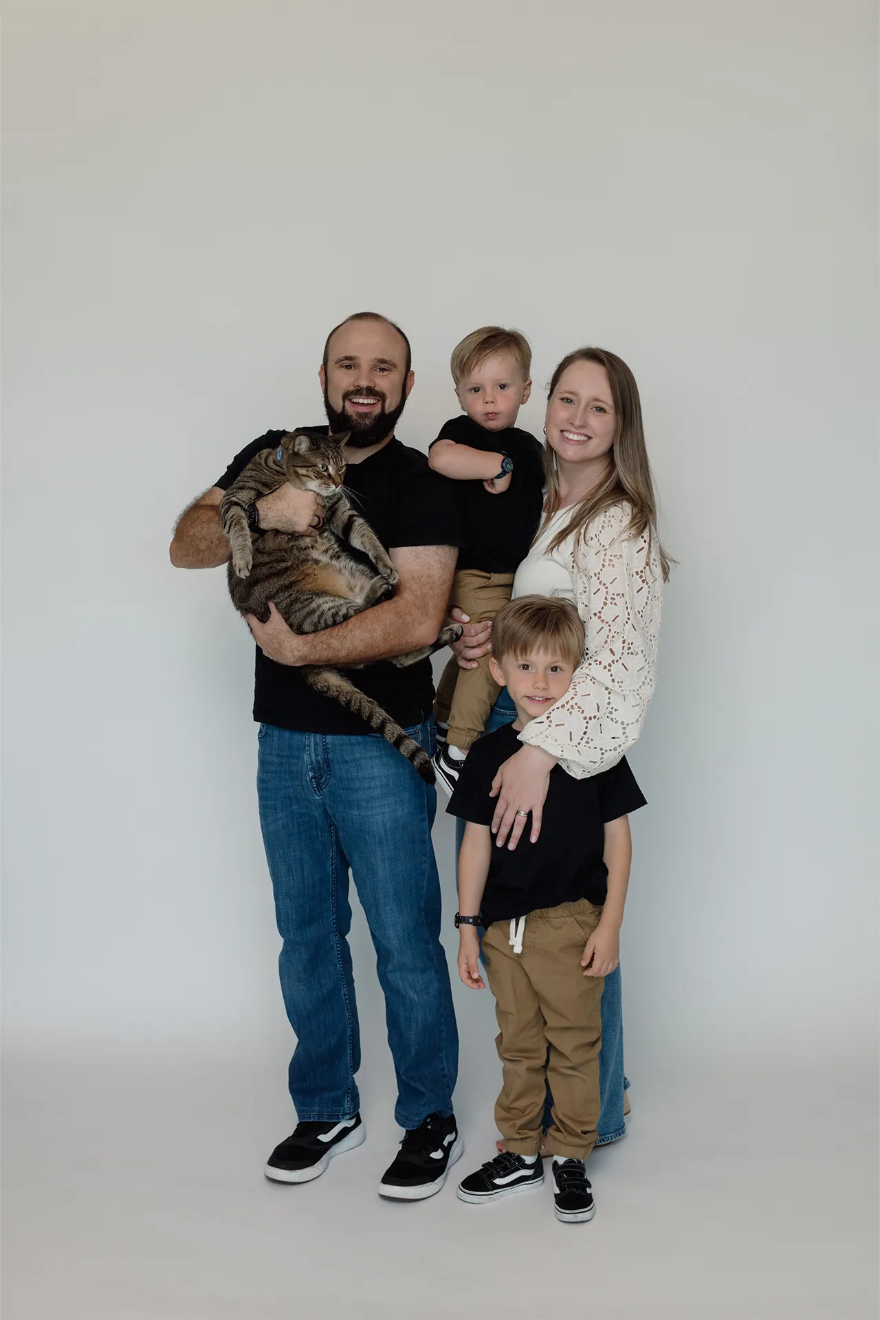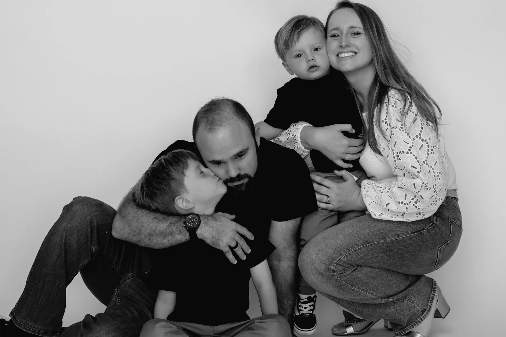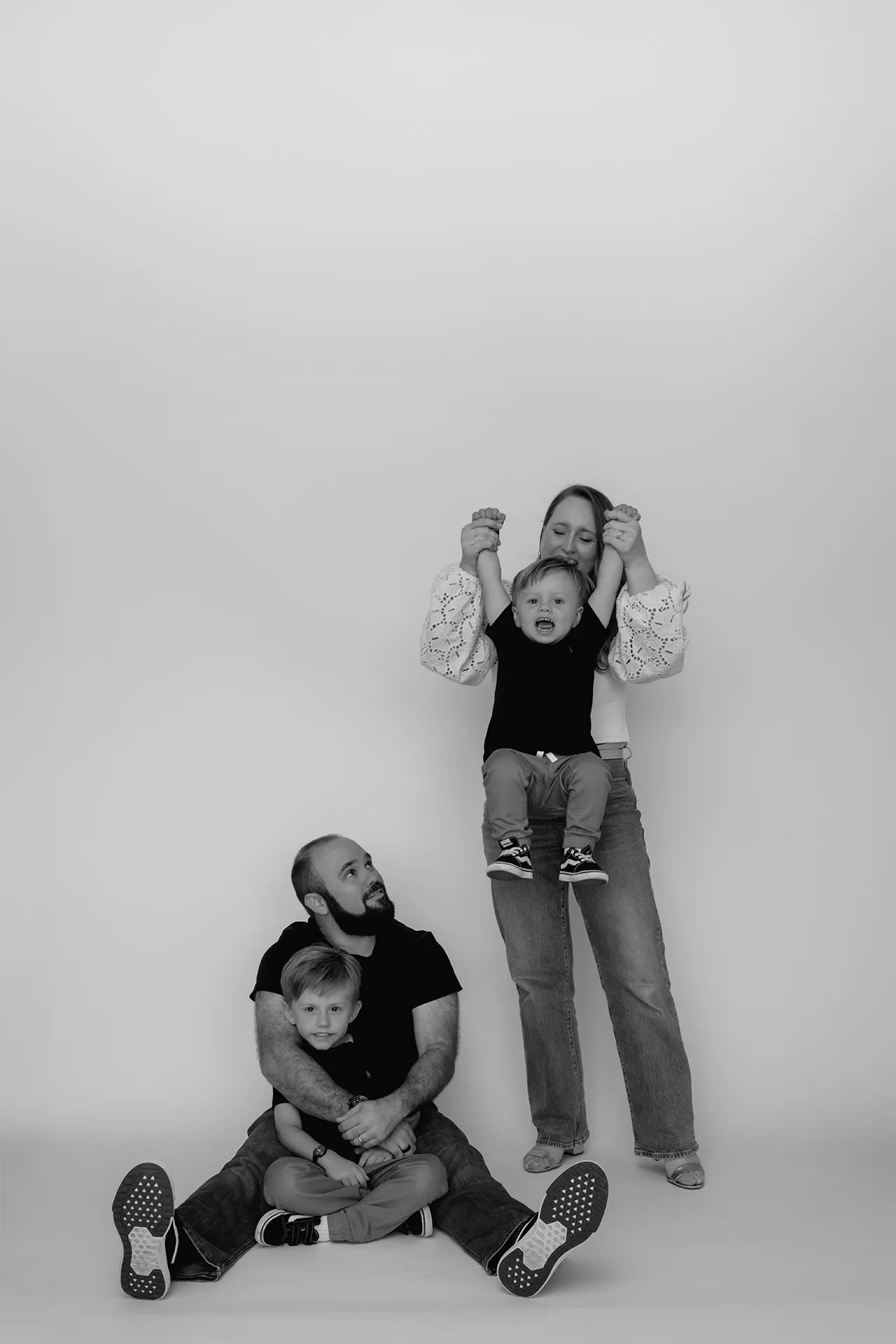 I brought a clean white backdrop to set the tone for timeless, bright images that focus on connection and expression. The session blended more traditional posed portraits with those candid, heart-melting in-between moments that truly tell the story of who they are as a family.